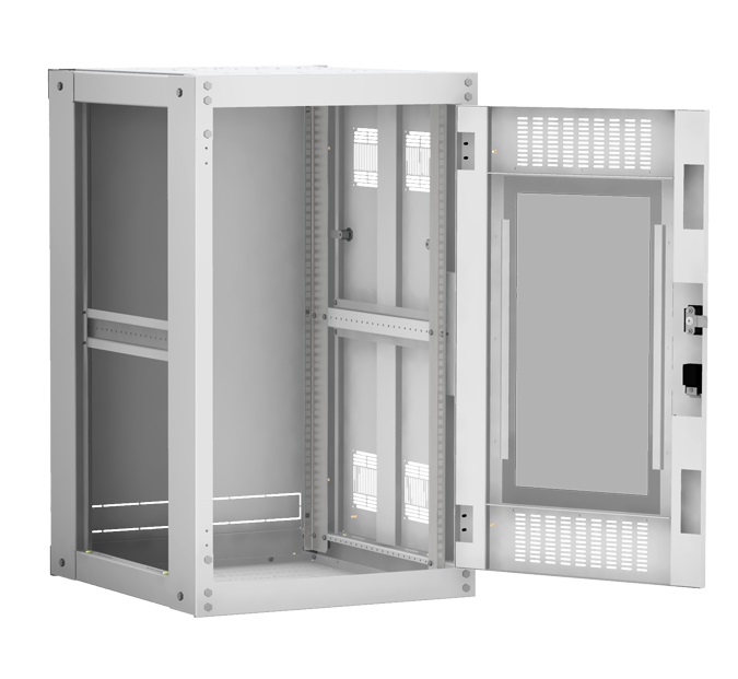 Наличие у шкафа двери с углом открытия 180 градусов и съемных боковых панелей и задней панели, предоставляет доступ для установки и обслуживания оборудования с четырех сторон.